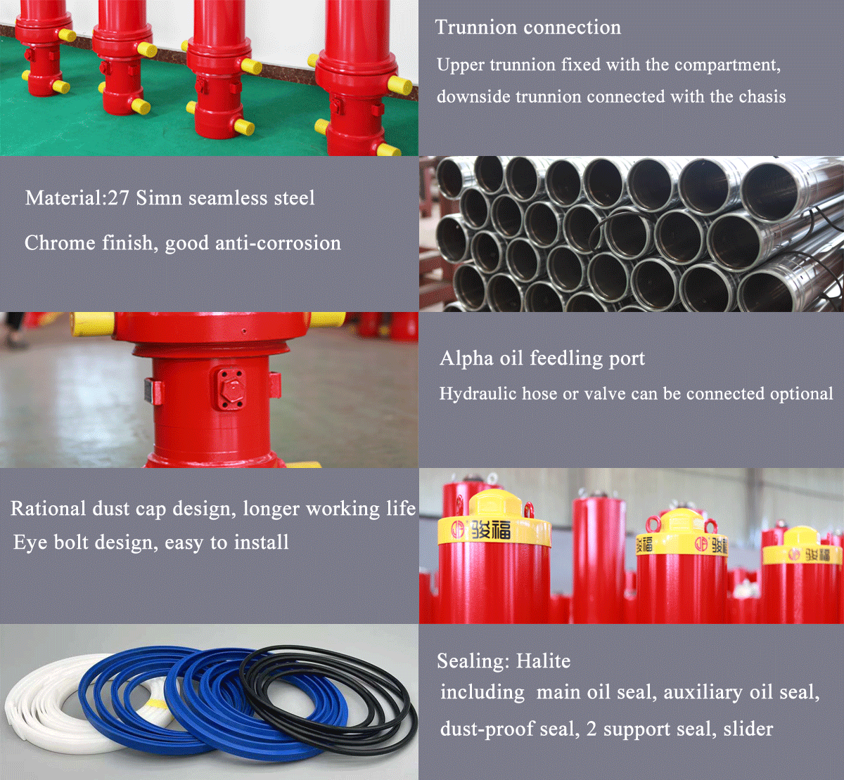 1. Safer Junfu hydraulic cylinder adopts excellent structural design and new material application, which can withstand the harshest working conditions and continue to work stably without disconnection, ensuring the safety of drivers and vehicles, and creating the most valuable safety for users.